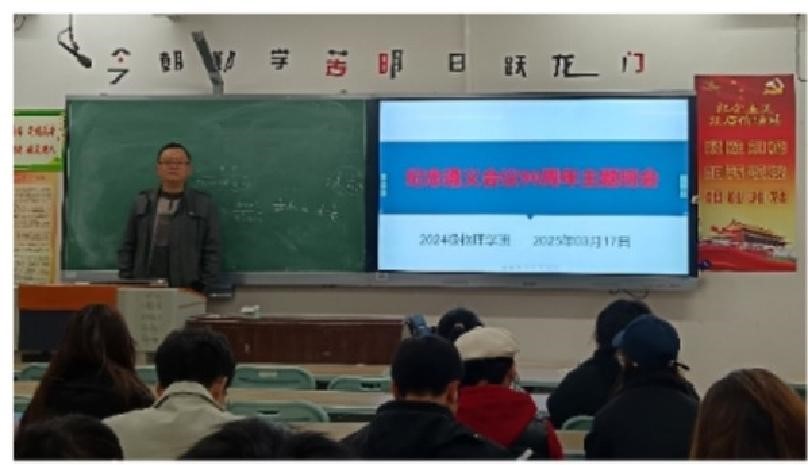 24物理学、23物理学、22数学与应用数学等班级均以“遵义会议90周年”为主题开展了班会。24物理班在班会上播放了纪录片《伟大的转折》部分片段,随后班主任通过讲故事的形式,带领学生们回顾了遵义会议的背景与重要意义。在交流研讨环节中,学生们结合自身成长经历,分享了他们对奋勇前行、不懈奋斗等精神的理解,现场气氛热烈。23物理学通过班委讲解、图片轮播的形式,让同学们认识到了遵义会议的重要性。22数学与应用数学在班委引导下观看相关视频,学习遵义会议精神,鼓励同学们发扬闯新路、破险阻的勇气,积极参与乡村振兴、科技创新等实践。22应用统计以“春日寻根,红色铸魂:坚定文化自信”为主题开展了班会。正值生机盎然的春日,班会以春日万物复苏的景象开场,随之讲述了革命先辈在春日里的英勇事迹。从春天打响的重要战役,到革命志士在春日为理想奔走呼号,同学们深刻感受到红色文化在历史长河中的磅礴力量。