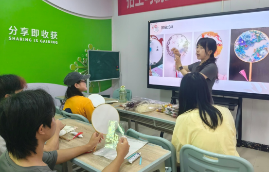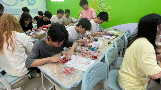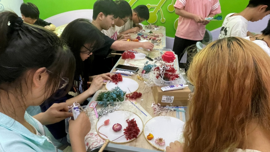 活动现场气氛温馨而专注。绣球、千层金、满天星、七彩菊等色彩缤纷、形态各异的干花材料——铺陈开来,供同学们自由选取。大家充分发挥想象力与创造力,在空白的团扇和书签上细心构图、巧妙搭配,全身心投入于指尖的艺术创作中。活动负责人穿梭其间,适时提供指导建议和鼓励。同学们或专注于精雕细琢自己的作品,或与身旁伙伴交流心得技巧,现场洋溢着轻松、愉悦且充满创造力的氛围。