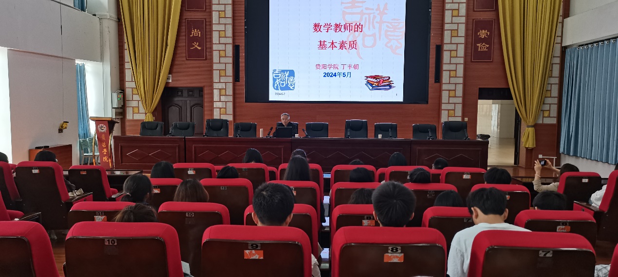 丁丰朝教授是贵州省优秀教师、原bw必威西汉姆联数学系主任。从教四十余年,此次为师生带来题为“数学教师的基本素养”的专题报告。丁教授的报告深入浅出,将自己在教学上深厚造诣和丰富的教学经验,用诙谐的语言向师生们娓娓道来;用生动的教学案例,诠释了数学教师基本素养的内涵和重要性,为聆听报告会的老师和同学们提供了宝贵的经验和启示。