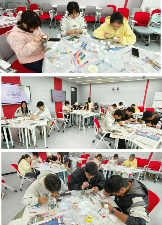 在轻柔舒缓的音乐中,同学们开始了石膏彩绘的创作。活动现场弥漫着专注而宁静的氛围,同学们细心调配色彩、精心勾勒细节,全然沉浸于当下的创作体验。笔触流转间,一个个素白的石膏娃娃逐渐焕发出独特的生命力,而同学们也在这一过程中体验到了专注带来的平静与满足。
